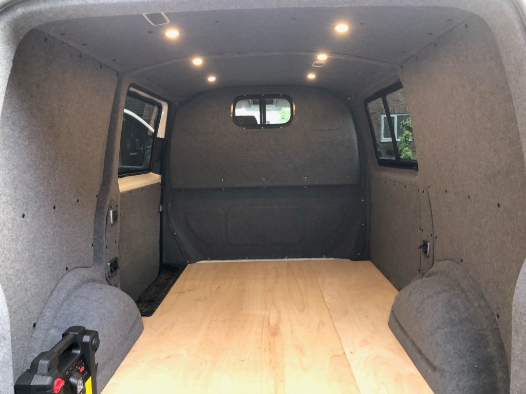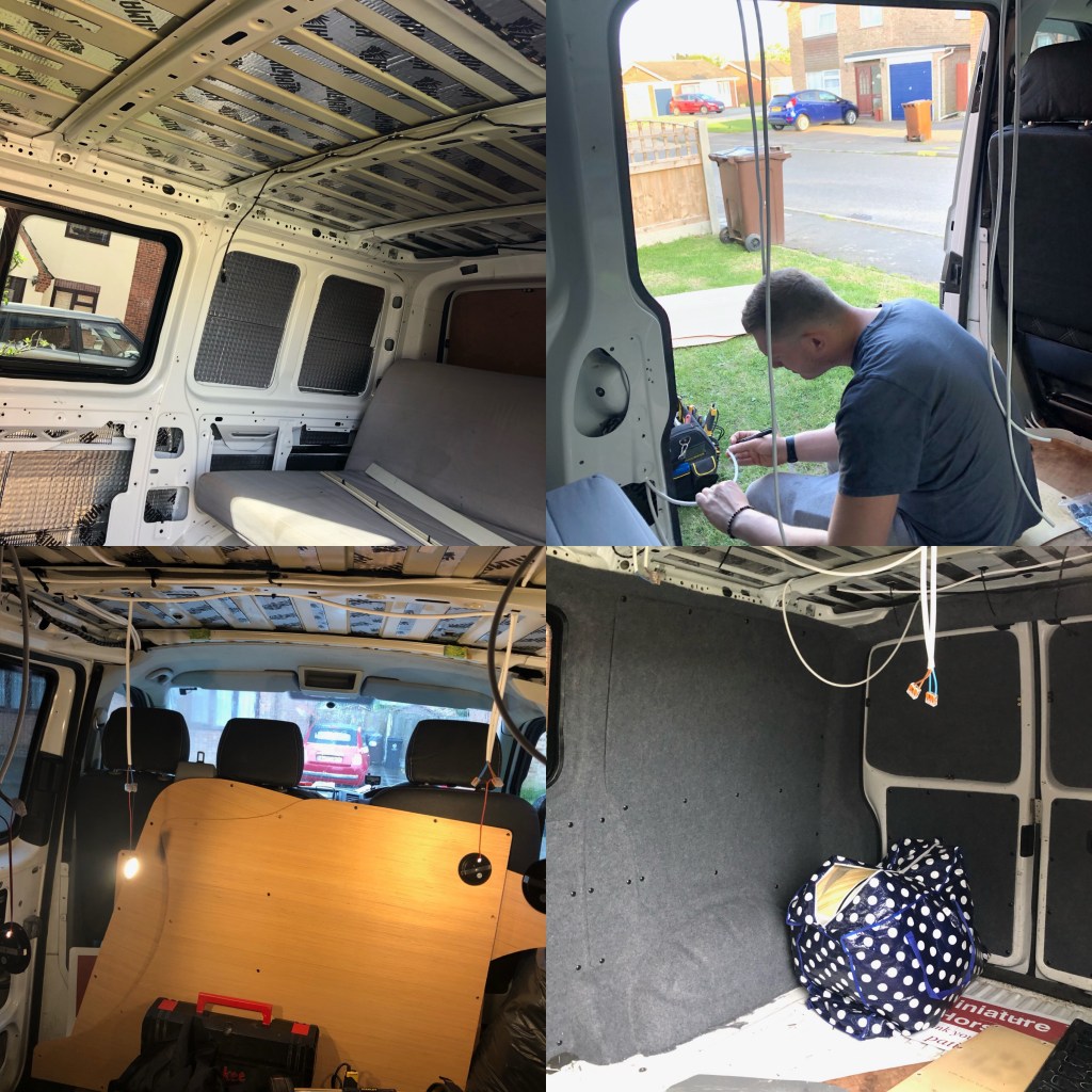 We realised that some elements of this van, despite its overall good condition, we’re going to require replacement, such as the floor of the living space, this was old, very weathered and showing signs of its former life as a plumbers van and miniature horse transporter… it was time for you to go! With this replaced and the wiring systems all installed, the exciting day of carpet lining was upon us! This was the bit we’d both been most looking forward to, as this shows the most amount of progress in a relatively quick space of time. Van build tip – this process requires patience, as exciting as it is, it can all go wrong quickly and change from a potentially sleek looking interior, to one that looks a bit rubbish!