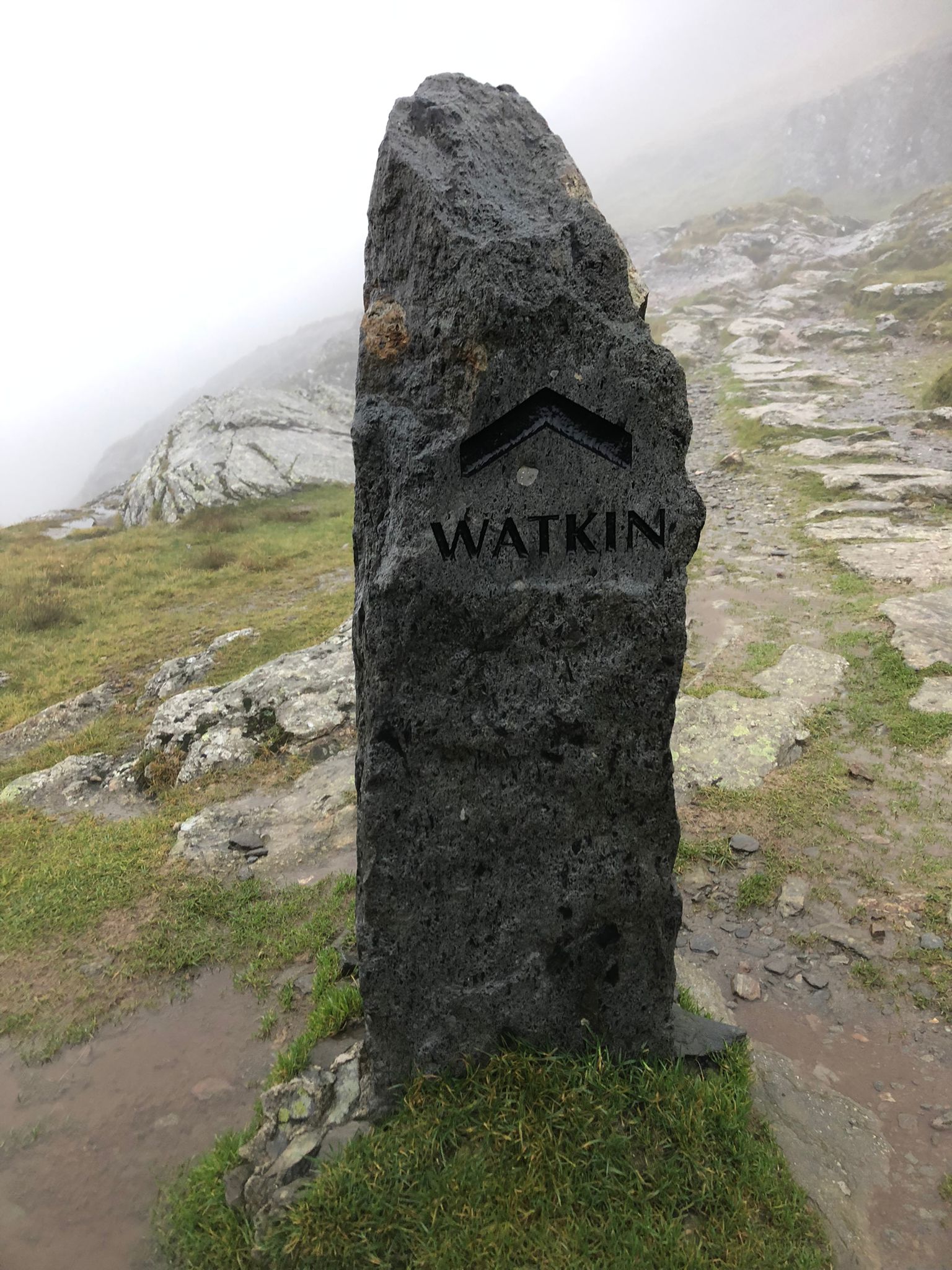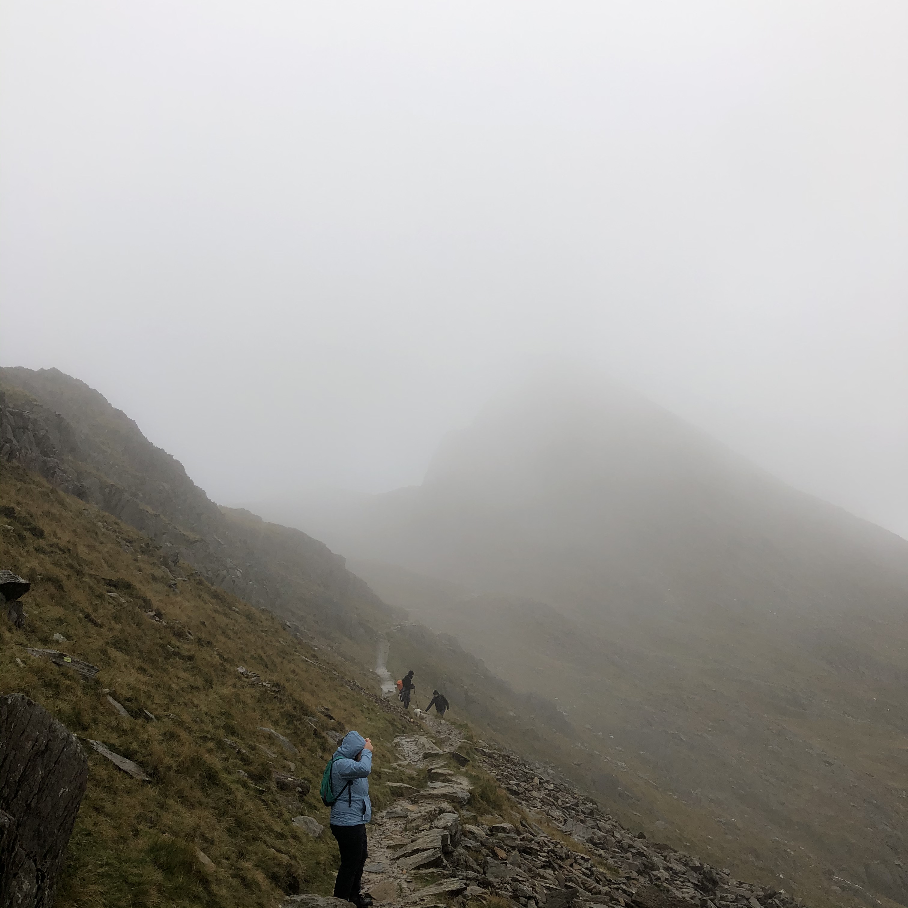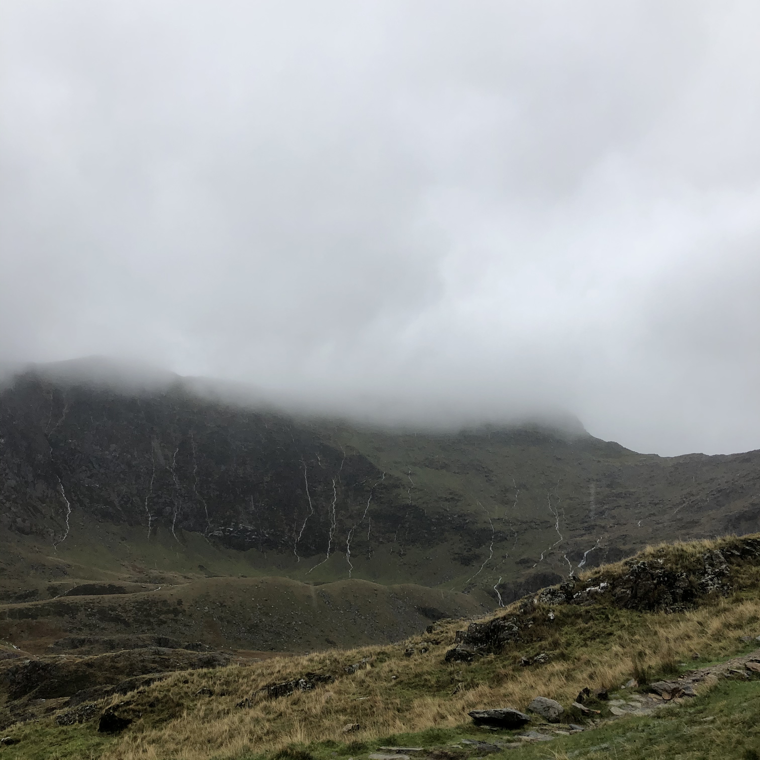 As we gained height, the path steepened until it began to disappear, the volume of water falling made the infamously steppy Watkin path into a waterfall, cascading down and some water finding its resting place among the sodden materials of our socks and boots… it certainly wasn’t like taking a paddle on a hot summers day – That’s for sure!
