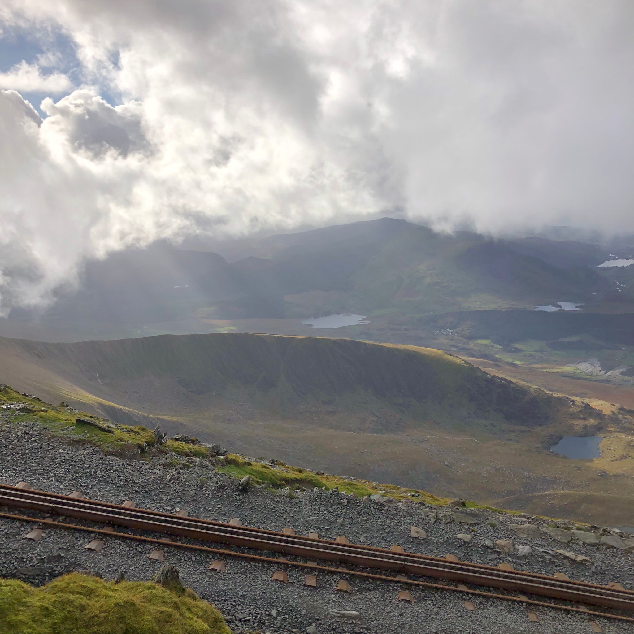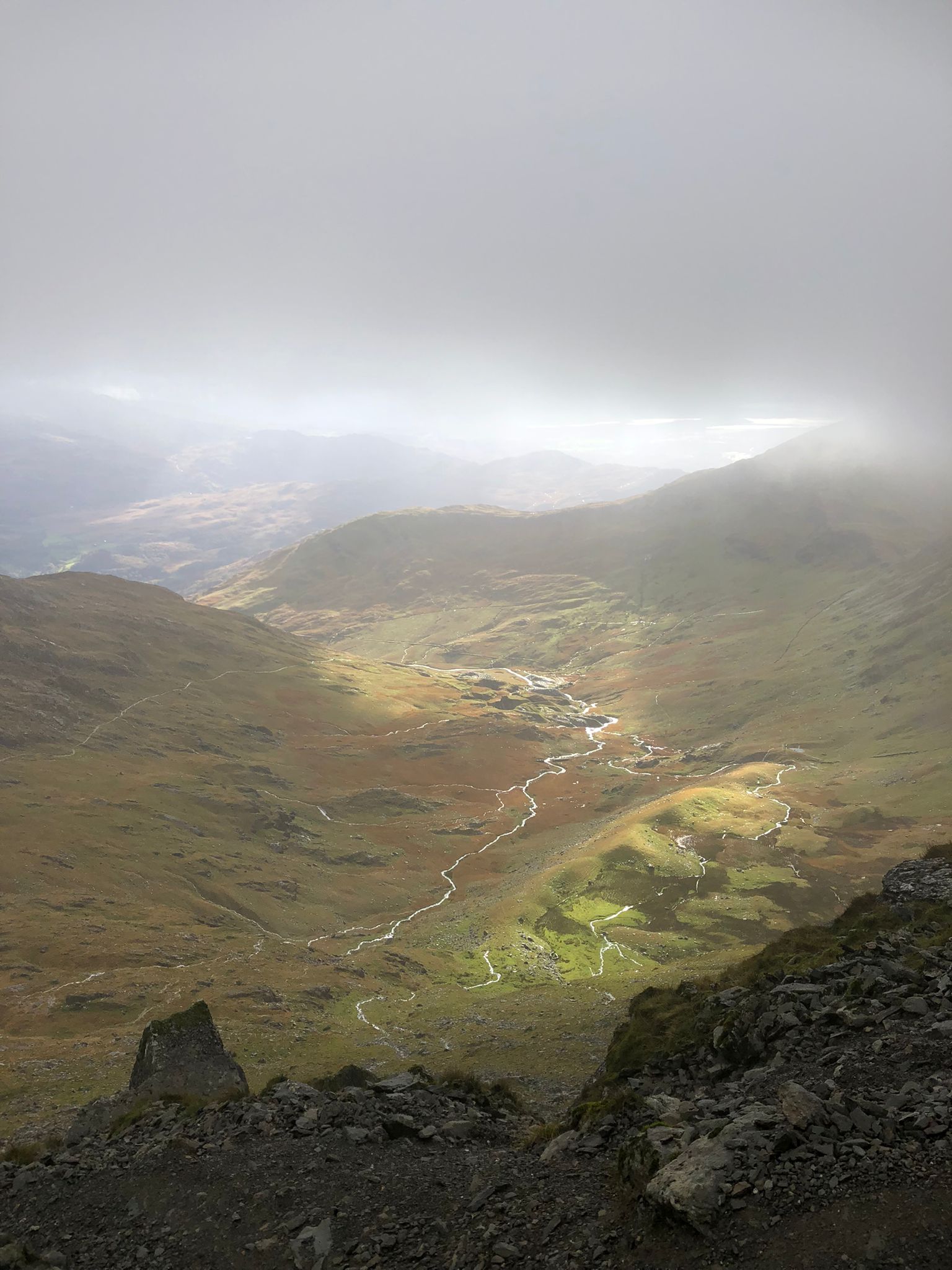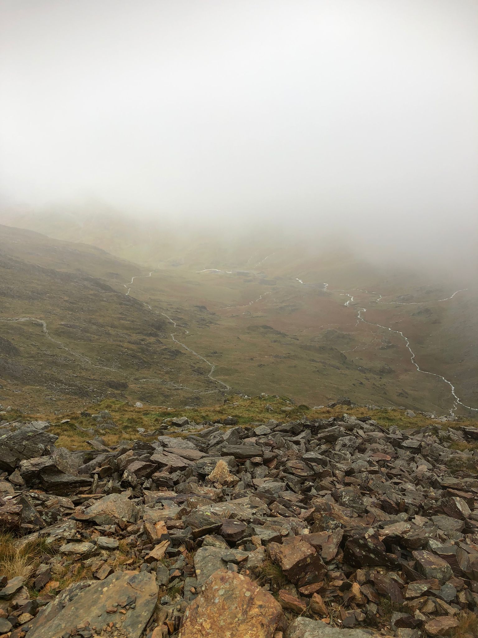 As we gained height, the path steepened until it began to disappear, the volume of water falling made the infamously steppy Watkin path into a waterfall, cascading down and some water finding its resting place among the sodden materials of our socks and boots… it certainly wasn’t like taking a paddle on a hot summers day – That’s for sure!