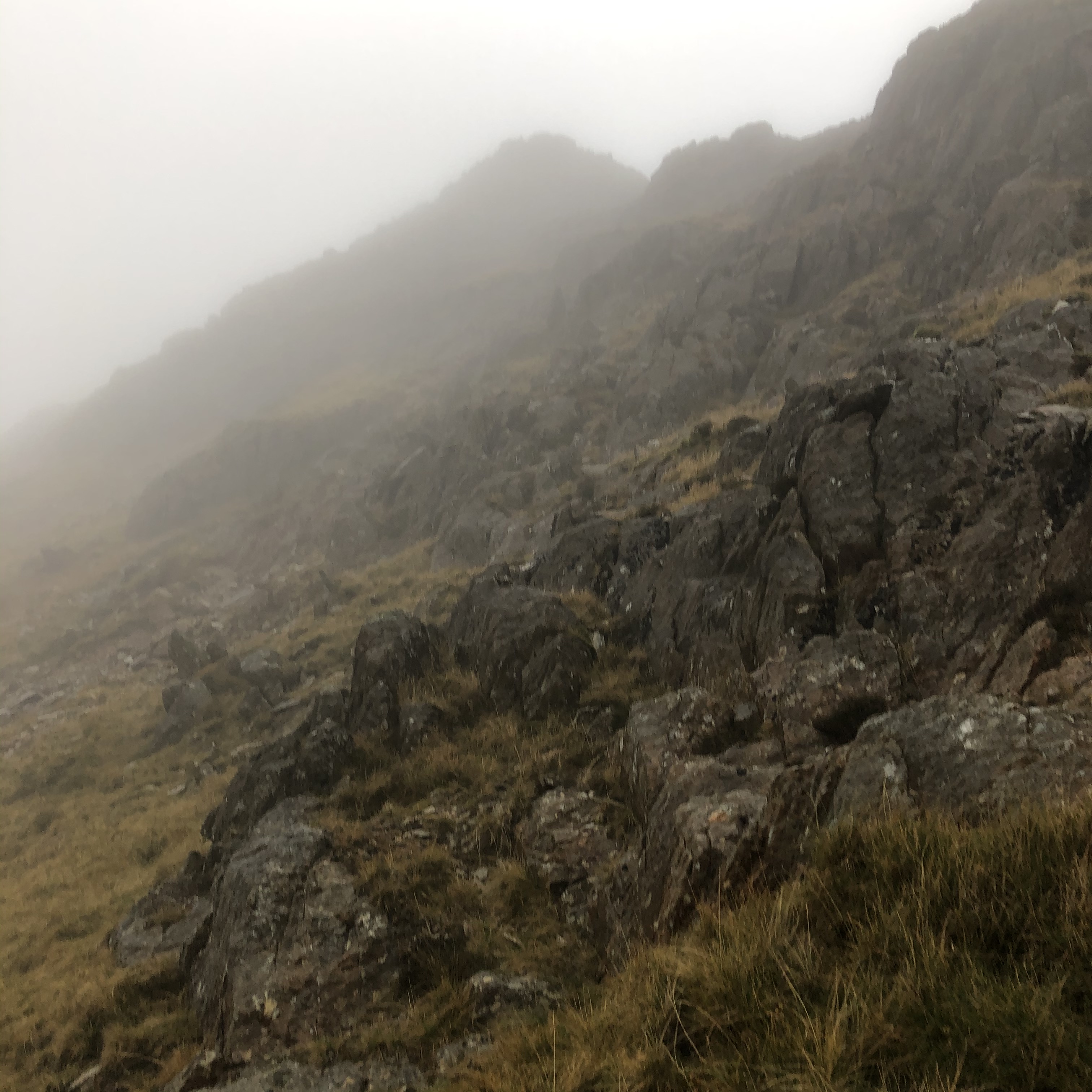 As we began to gain some real altitude, the weather conditions began to slightly improve, which was a huge and very welcome respite from the relentless wind and rain, which even felt like it was coming out of the floor at times. This became a great source of positive morale for us both, but we were still quite wet and quite cold. We really began to feel the atmosphere the mountain was emitting on the day and it was incredible, on one side undeniably beautiful, the other undeniably sinister. The veins of water marbling the ridge line and menacing low cloud forever obscuring the chance of seeing the summit from the path, it was breathtaking!